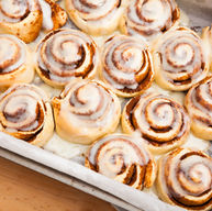 Sold by the half dozen or dozen: Cinnamon rolls, cookies, brownies, lemon bars, muffins, danishes, scones, dinner rolls, pita bread, jumbo pretzels, and biscuits.